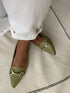 Las Bailarinas Oliva estilo  slippers  son mucho más que un zapato: son una declaración de estilo. Su elegante tono verde oliva con acabado efecto cocodrilo mate y detalle dorado las convierte en la pieza perfecta para destacar con clase.